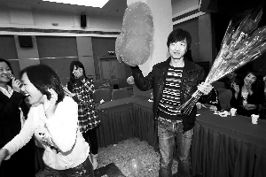 拿著手中的方片Q,來自中國傳遞社的26歲小伙蔣超當上“國王”,他和“王后”合唱《纖夫的愛》。蔣超笑稱:“今天我的桃花運不錯”。