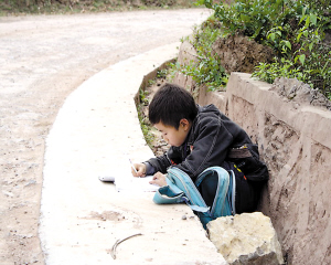 “他不被路過的汽車、行人而影響,以溝為凳子,公路路沿為桌子,認真地寫著作業(yè)!弊蛱欤浾哒业搅司W(wǎng)友“情緣”發(fā)布的《公路邊寫作業(yè)的娃》。因為已有超過1400次的點擊和50余人次的回復(fù),該帖子已被版主“置頂”。帖子中貼出了6張圖片:一段崎嶇彎道旁,一名身材矮小的小男孩正蹲在公路排水邊溝中,佝僂著身體,做作業(yè)。旁邊還有一個藍色書包和課本。