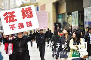 “征婚,不差錢”。昨日下午,在南京新街口正洪街廣場,一名青年女子高舉寫著這五個大字的廣告牌,從逛街的人流中走過,雷人的廣告詞引來眾多市民圍觀。緊跟在后面一名中年男子舉著另一塊廣告海報,密密麻麻的文字揭示了其中的玄機。原來,中年男子是南京一家婚介公司的負責人,此舉是為北方某地一千萬富翁征婚。記者通過QQ聯(lián)系采訪了這名富翁,得知這位北方漢子竟對南京女孩情有獨鐘,執(zhí)意要在南京找到另一半。