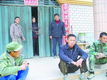 昨日上午,記者來(lái)到許德成家,院子里有幾名男子,房門(mén)被一根鐵鏈鎖住,一名女子扒著門(mén)縫向外看(如圖),許德成也在屋內(nèi)。