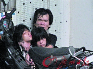 當三輪摩托車開到城東派出所門前,杜某民嫌車速太慢,叫司機開摩托車進入城東派出所院內。下車后,杜某民用小刀架在小李的脖子上,用手扣住小袁的脖子(見圖),大聲叫喊:“有人殺人了,快報案”,然后把小李、小袁兩人推到城東派出所飯?zhí)靡唤锹,又叫:“把所有公安都叫出來。?/p>