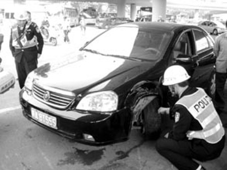 見狀,行人欲上前堵截,小車司機(jī)卻打正方向繞至北面正常車道。目擊者張先生說,當(dāng)時(shí)路邊還停著一輛警用摩托,可小車司機(jī)就像昏了頭,居然還徑直往上撞。隨后倒車又撞向一處橋墩,最后車輛因輪胎爆裂被迫停下。