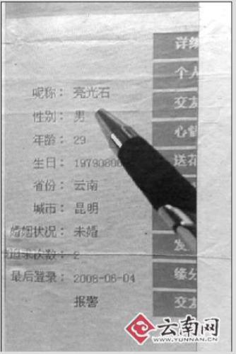 去年3月,網(wǎng)名為“迷惑夢中人”的小麗(化名)閑著無事,便上云南信息港的交友網(wǎng)上玩耍,當看見網(wǎng)名叫“亮光石”的征婚廣告:“29歲,無不良嗜好,采礦業(yè)執(zhí)行官,月收入兩萬元。誠征20至28歲的單身女孩為終身伴侶,學歷高中即可”時,小麗記下了他的聯(lián)系方式,雙方還互相留下QQ號碼。