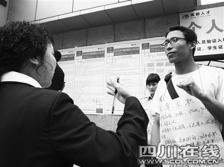 “求職意向不限,只要不違背道德和法律;出讓5年青春,每年年薪10萬!毕胍舐,卻又不帶任何相關(guān)證件,只靠胸前掛著的“賣身求職”的告示,出現(xiàn)在招聘會門外,尋求用人單位和他聯(lián)系。昨日,寧夏街中國成都人才市場正舉辦一場人才招聘會,而招聘會大門外,一名胸前掛著“賣身求職”告示的年輕人,卻引來周圍群眾紛紛駐足。對于年輕人這種行為,用人單位看法不一。