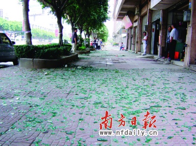 昨日,記者再次來到事發(fā)地看到,警方仍未解除警戒線,幾名民警在現(xiàn)場(chǎng)緊張勘察。事發(fā)街道兩旁的玻璃碎片仍是灑落一地,離爆炸核心位置20多米遠(yuǎn)的一家修理店老板介紹,很多玻璃碎片都是從對(duì)面街道飛過來的,他指著一塊插入卷閘門的石頭說:“這個(gè)也是從對(duì)面飛過來的,當(dāng)時(shí)爆炸的威力太可怕了!