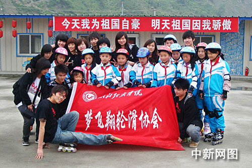 映秀小學是地震受災(zāi)最嚴重的小學之一,有些孩子因為地震而殘疾。表演活動中,輪滑協(xié)會的成員不顧旅途勞頓和場地沆洼不平,用高水平的輪滑表演向孩子們傳遞一個積極的人生信念:跌倒了,再爬起來,這就是輪滑,這就是人生。表演間隙,他們還與孩子們進行“蘿卜蹬、上下左右”等游戲,讓孩子們體會到愛沒有距離。