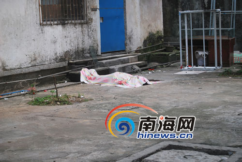 上午10時(shí),南海網(wǎng)記者趕到事發(fā)現(xiàn)場(chǎng)時(shí),墜樓者的遺體仍躺在原地,上面蓋有一層床單。墜樓地點(diǎn)為科技大廈后面的停車(chē)場(chǎng),尸體左邊就是圍墻,右邊停放著幾輛車(chē)。