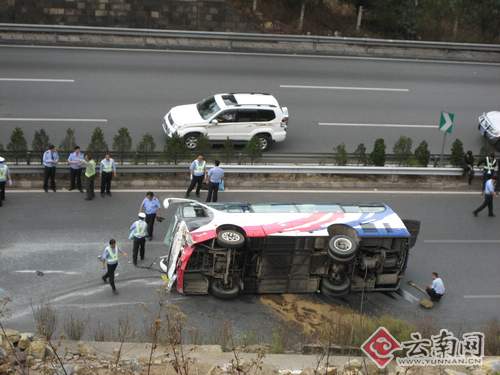 18日下午1點(diǎn)45分,安楚高速公路昆明至楚雄方向K128+500米處(孔家莊隧道出去1公里)發(fā)生一起重大交通事故,一輛從下關(guān)開(kāi)往昆明載有29人的中型客車發(fā)生側(cè)翻,當(dāng)場(chǎng)死亡1人,28人受傷,其中重傷1人。事故發(fā)生后,交警部門對(duì)楚雄至昆明方向的高速路實(shí)施了封閉,記者去現(xiàn)場(chǎng)只能從320國(guó)道繞行至山上的小路,站在在距離事故現(xiàn)場(chǎng)約30米的山坡上,記者看到在開(kāi)往昆明方向的高速路上,一輛客車側(cè)翻在路中間,雖是開(kāi)往昆明方向,但車頭卻調(diào)轉(zhuǎn)了朝著相反方向。凹陷的車頭上,擋風(fēng)玻璃像蜘蛛網(wǎng)一樣滿是裂痕,右側(cè)有個(gè)很大的窟窿,車身旁邊一道長(zhǎng)長(zhǎng)的劃痕非常明顯,車身下漏了一大灘汽油,一塊標(biāo)有大理兩個(gè)字的白色牌子飛到了距離客車有5、60米的地方。這時(shí)交警部門正在做現(xiàn)場(chǎng)勘查,在汽油上散上了沙子。 “嘭”,我當(dāng)時(shí)聽(tīng)到一聲巨響,跑出來(lái)一看,就看見(jiàn)一輛客車翻在坡底的高速路上,有個(gè)人被甩出了車外躺在地上一動(dòng)不動(dòng),其他的乘客在車上哭的哭,喊的喊!备咚俾放缘某鄞笸叻看宓囊晃淮迕衲慷昧塑嚨湑r(shí)的情景。附近一位路過(guò)的駕駛員猜測(cè)說(shuō),從擋墻在撞擊的痕跡上看,客車可能是撞上可擋墻后,又反彈回來(lái),駕駛員急忙打方向盤,車子就來(lái)了個(gè)360度大轉(zhuǎn)身后翻倒在地!斑@段路過(guò)了隧道后,因?yàn)槭窍缕侣范,不少大車司機(jī)踩剎車時(shí)會(huì)不停地淋水,所以路面比較滑,司機(jī)車速稍一快就容易出事!