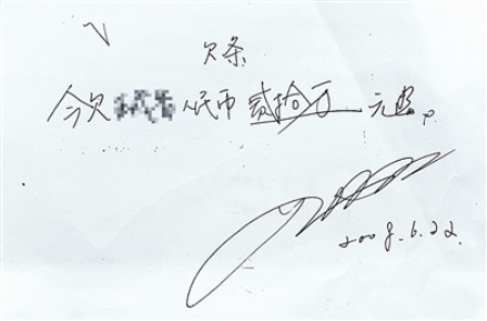 拿到錢后,雅暉寫了張欠條:“今欠老婆人民幣二十萬!背_始沒有細(xì)看,隔了兩天,又覺得不妥,找了個合適的機(jī)會提醒了雅暉一下,“他把老婆改成了我的名字,但是簽名是用的藝術(shù)簽名,一共有8條弧線,我實(shí)在沒認(rèn)出來,不過我想以后都快是夫妻了,還計較這些干什么呢?”
