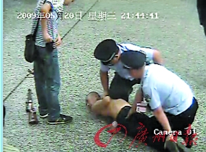 晚上9時44分41秒,兩人合力將男子摔倒在地,小鄧立即拿出手銬控制住男子。