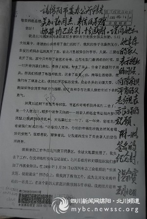 “請綿陽市委辦公廳轉(zhuǎn)告吳加勤同志,來信及承贈郵冊均已收到,十分感謝。謹向她和她幸存的家人表示親切的問候,向陳家壩所有的父老鄉(xiāng)親表示良好的祝愿。附一簽名的紀念封。溫家寶 五月十七日”。(楊亦萱)