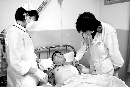 昨天晚上,記者聞訊后迅速趕到西京醫(yī)院,在急診科三樓的病房里,急診外科的醫(yī)生朱金文躺在病床上,他的左側(cè)胸部上貼著一大塊白色的紗布,胳膊扎著一根針管正在輸液。據(jù)目擊者說,下午4時許,一名五十多歲的病人在幾個人的陪同下來到急診外科就診,說是在交通事故中受了傷。醫(yī)生就開始給病人做檢查,可病人的手一直捂著胸部,拒絕檢查。此時,不知何因,病人打了醫(yī)生兩拳。醫(yī)生并未發(fā)火,隨后停下檢查,過了一會兒又過去查看病人。病人突然情緒失控,拿出一把小刀朝醫(yī)生胸部捅去,醫(yī)生趕緊用手壓住傷口跑到急救室。