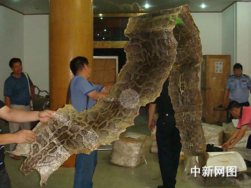 據防城港市森林公安清點統(tǒng)計,警方截獲的大貨車內共有173只熊掌、4張蟒蛇皮和國家二類保護動物穿山甲1只。其中,最長的蟒蛇皮達5米。