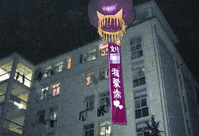 50支蠟燭擺成心形,兩個(gè)氫氣球拉起“劉某,我愛你”的紅色條幅,遙控直升飛機(jī)送情書(見上圖)。前晚10時(shí)許,湖北大學(xué)三期學(xué)生公寓E棟女生宿舍樓下,剛完成高考的天門小伙小吳成為這場(chǎng)校園求愛的主角。