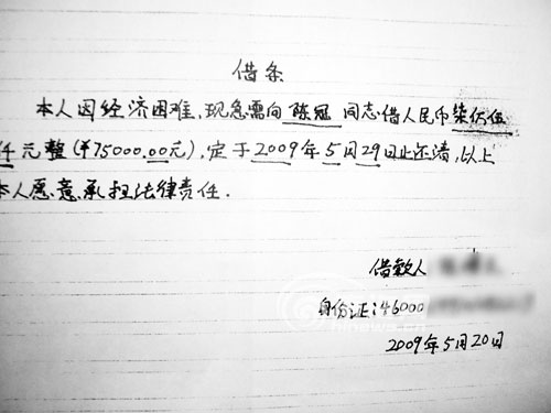 小鋒給記者看3張借條復(fù)印件,記者在5月20日小鋒向阿冠所寫的借條上看到:本人因經(jīng)濟(jì)困難,現(xiàn)急需向阿冠同志借人民幣75000元,定于今年5月29日止還清。借條最下角是小鋒的簽名手印畫押。隨后5月22日和5月24日的另兩張借條,放貸者另有其人,分別借款1萬(wàn)元和45000元,還款期限都為7天。