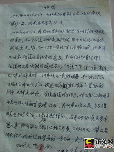 但事情到后來(lái)卻發(fā)生了變化——6月13日,再次來(lái)京的兩位舉報(bào)者帶來(lái)了李金全,李金全說(shuō):記者采訪時(shí),自己介紹的其他情況都是真實(shí)的,但簽字一事沒(méi)有講真話。在調(diào)解書(shū)上,自己是簽了字的。以前,記者采訪時(shí)在這個(gè)問(wèn)題上之所以沒(méi)有說(shuō)實(shí)話,一是擔(dān)心承認(rèn)自己當(dāng)初經(jīng)不起法官的威脅和引誘,在損害集體利益的調(diào)解書(shū)上簽過(guò)字,村民們會(huì)瞧不起他這種軟骨頭。二是怕記者不敢碰硬揭露本案的內(nèi)幕,想以否定自己簽字的假情況引起記者重視。但如今記者要發(fā)稿了,為了對(duì)事實(shí)負(fù)責(zé),所以愿意說(shuō)出當(dāng)時(shí)的真實(shí)情況。