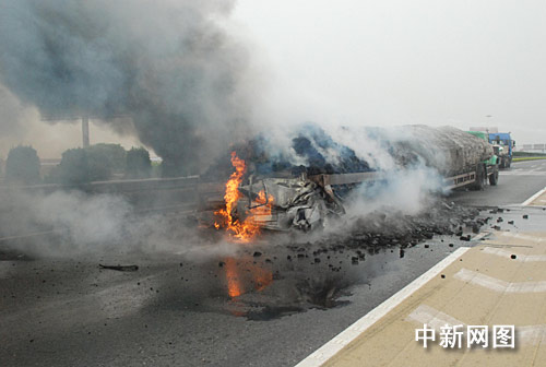 事故發(fā)生后,金華消防立即調(diào)派了一輛搶險(xiǎn)救援車一輛水灌車11名消防隊(duì)員趕赴事故現(xiàn)場。6時(shí)55分,消防隊(duì)員趕到事故現(xiàn)場看到:牌照為黑B•F0289裝滿煤炭的大掛車停在一旁,小轎車整輛車已完全鉆入了大掛車的底部,車尾正燃著熊熊大火。