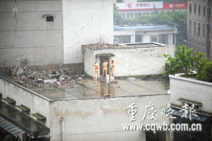 昨日下午5點(diǎn)30分,大渡口區(qū)文體路順祥壹街區(qū)A2棟16樓,28歲的劉莉正在自家廚房做飯。她不經(jīng)意地往窗外一望,只見約兩百米開外的一棟破舊樓房頂上,幾條白花花的身體映入眼簾——幾個(gè)成年男子脫掉衣褲,腳邊放著水桶,竟然又在屋頂洗澡!