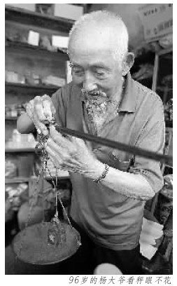 “大爺,幫我稱點白糖……”一名顧客喊道。只見老人從一大袋白糖中用勺子舀了一小袋,放在柜臺上的秤盤上,輕推秤砣!耙唤锒䞍!”老人喊道,“二元五一斤,一斤二兩三元!”這,恐怕只是96歲的楊大爺日常生活中的一個普通瞬間吧,記者尋思!按鬆,幫我拿包藍嬌嘛……”為了進一步驗證人們的說法,記者說道!12元!”楊大爺從十幾個品牌的香煙中,準確地拿了一包藍嬌放在柜臺上!罢夷88元!”見記者拿了一張百元紙幣,楊大爺隨即回話。楊大爺把百元大鈔放到陽光下,細細查看水印,并不斷用手摸著紙幣的防偽標志。確認為真幣后,楊大爺迅速地給記者找了零錢。