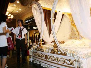 走進五號館展場,幾乎所有人的目光都會立即被成都本土企業(yè)制造的一張價值五十萬元人民幣的豪華大床所吸引。據(jù)制造商介紹,這張價值五十萬元人民幣的豪華大床是用橄欖木材耗時六個月純手工雕刻而成,“這張床的設計理念取意于西班牙古代皇室風格。除做工精美外,整張床還鑲嵌了純金箔和二十六顆施華洛世奇水晶,目前單張床的市場售價在五十萬元人民幣以上!