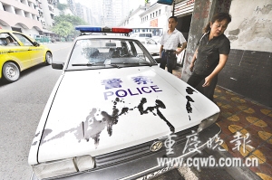 昨日,長(zhǎng)航公安局朝天門派出所門前停車場(chǎng),有不法人員惡作。合群笤诎▋奢v警車在內(nèi)的4輛車上用油墨涂鴉。警方稱,惡作劇者涉嫌故意損毀公私財(cái)物,可處10日以上15日以下拘留,并處罰款1000元。