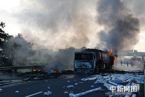 據(jù)江門市交警部門稱,27月8日05時20分,一皖籍大型貨車運載PVC管沿開陽高速公路往陽江方向行駛,行至開陽高速公路恩平市大槐路段時,與前方運載甲醇的一粵籍的重型半掛牽引車發(fā)生碰撞,碰撞后,兩車迅速著火燃燒,皖籍大型貨車車上三人當場死亡。
