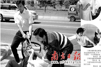隨后,南方都市報攝影記者陳奕啟與管理員吵起來,推搡中管理員撕裂記者的衣服,并再出招“鎖喉功”。一名市場管理員一拳打中陳奕啟頭部,推搡中陳奕啟被推下人行道,然后又被按倒輪番連踢帶踹,其中一人雙手鎖住記者喉嚨,一人強(qiáng)行搶走攝影包。