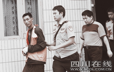 昨日中午12時,劉啟寬穿著彭州市看守所的衣服,戴著手銬,左手包扎著紗布,被警方帶回事發(fā)現(xiàn)場。他個子高高的,又瘦又黑,沒有穿鞋,始終低頭不語。就在劉啟寬指認(rèn)現(xiàn)場的時候,其哥哥劉啟保也回來了。兩兄弟對望一眼后,都匆匆把視線移向別處。