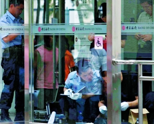 事發(fā)中國銀行位于北科大籃球場西側(cè),高兩層,分為對私業(yè)務(wù)區(qū)和基金業(yè)務(wù)區(qū)。昨日中午12時(shí)10分許,顧客王明(化名)進(jìn)入該行準(zhǔn)備提款!叭抛簧献奈鍌(gè)顧客,兩個(gè)開放的銀行窗口前各有人在辦業(yè)務(wù)。”王明說。