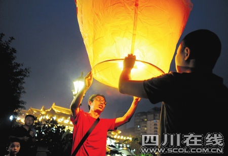晚8點(diǎn),合江亭邊天色還未全暗,“范跑跑”身著紅色T恤、休閑短褲和一群藝術(shù)家安靜地坐在竹椅上等候。8點(diǎn)30分左右,德籍華人藝術(shù)家蔡青招呼眾人,《祈愿》正式開始,范跑跑徑直走向安放孔明燈的紙箱旁。“我們的孔明燈是從臺(tái)北郵購(gòu)過來的。除了要用孔明燈為地震逝者祈愿,還寓意海峽兩岸人對(duì)生命的尊敬。下面我和范老師將共同放飛孔明燈,愿意參與的市民都可以加入!辈糖嗍谴舜位顒(dòng)的主要發(fā)起人,作為常年旅居國(guó)外的德籍華人藝術(shù)家,蔡青說多次前往映秀、北川等災(zāi)區(qū),大片廢墟令他很震驚。蔡青點(diǎn)燃孔明燈后,邀請(qǐng)“范跑跑”和他共同扶住燈的底框,將高達(dá)1米左右的孔明燈逐個(gè)放飛。