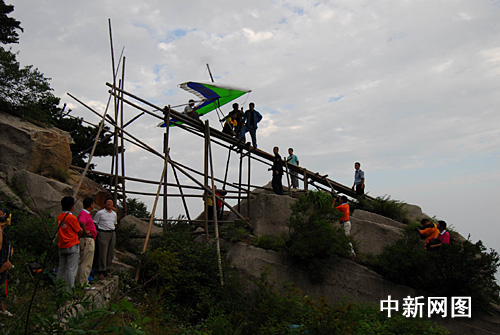 西岳華山,在全球華人的心中有著特殊的地位。金庸大師2003年10月登頂華山論劍,更使華山聲名遠(yuǎn)播。海拔2082米的華山西峰為華山五大主峰之一,一塊完整巨石,渾然天成,絕崖千丈,似刀削鋸截,其陡峭巍峨、陽(yáng)剛挺拔之勢(shì)是華山山形之代表。一般從事滑翔運(yùn)動(dòng)的愛(ài)好者自此飛躍而下并滑翔直線行程6公里。