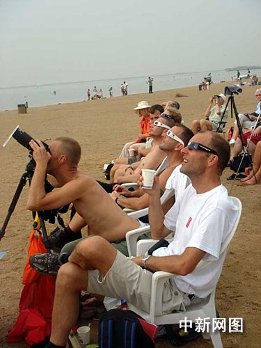 當(dāng)天早晨七點(diǎn)左右,記者來自上海市郊的金山城市沙灘。在這一被稱為本次日全食中國(guó)最佳觀測(cè)點(diǎn)之一的沙灘上已經(jīng)聚集了一千多名境外天文愛好者。據(jù)悉,此次“跨國(guó)追日”活動(dòng)是由上海、江蘇、云南三地的八家旅行社策劃組織的,成員分別來自美國(guó)、加拿大、意大利、西班牙、荷蘭、瑞典、丹麥、日本、泰國(guó)等國(guó)家。