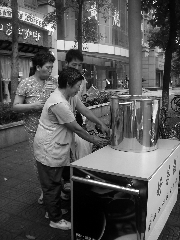 近日,在西溪路上,黃龍商圈附近的寫字樓邊,出現(xiàn)了一個免費涼茶點。