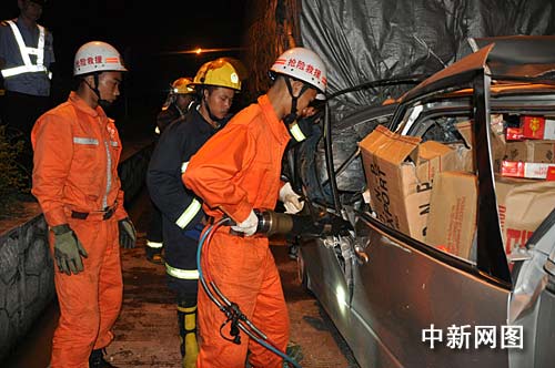消防官兵隨后展開施救工作。由于車頭變形嚴(yán)重,消防官兵只得輪流使用消防撬棍、液壓剪擴(kuò)器和切割機(jī)將兩邊的車門打開,然后將車上香煙搬出,再把兩人的座位靠背放直,兩名被困人員才得以依次抬出。經(jīng)現(xiàn)場120急救人員證實(shí),兩人已經(jīng)死亡。