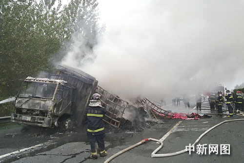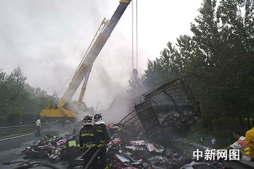 中新網(wǎng)南京七月三十一日電(衡中強 馬曲侃 朱曉穎)記者從淮安市消防支隊了解到,今日上午在京滬高速公路江蘇淮安市段九十三公里處一輛大貨車突發(fā)自燃,車上所載大量衣服和被套全部被焚為灰燼。由于火勢過猛,消防官兵用了兩個小時才將大火撲滅。