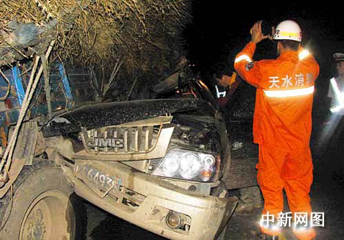 消防官兵到達(dá)現(xiàn)場后,發(fā)現(xiàn)一輛車號(hào)為川H64935的皮卡車撞進(jìn)與同向行駛的一輛車號(hào)為甘E03749載有秸桿的貨車左側(cè)的后輪胎處,“皮卡”車身嚴(yán)重?fù)p壞,地面血跡斑斑。車禍致“皮卡”車上一人當(dāng)場死亡,“皮卡”內(nèi)另有兩名傷者隨即被先行趕到的120急救車送往醫(yī)院救治。