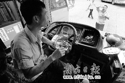 將近下午1點(diǎn),十幾位身著黑褲、淺藍(lán)襯衣的司機(jī)才端著餐盒,一陣?yán)峭袒⒀?他們都是站著,吃飯的速度驚人的快。房間里,6個(gè)不銹鋼的圓桶分別裝著米飯、菜肴、湯水,靠墻的架子上擺著一排排的飯盒、水壺———這座不起眼的狹長的平房,既是司機(jī)發(fā)車簽到的地方,也是他們的臨時(shí)食堂。
