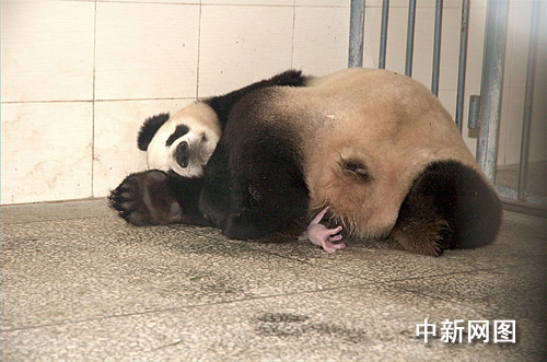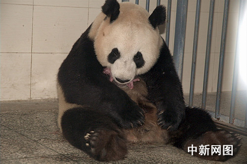 7日晨6點46分,“甜甜”開始出現(xiàn)產前征兆,8點13分破羊水,在經過3個多小時的努力后生下一對健康的雙胞胎。初次當媽媽的“甜甜”努力嘗試將寶寶叼在懷里,但小仔亂動亂叫,很快又滑落到了地上,經過多次努力,小仔終于在媽媽懷里安靜下來,“甜甜”用舌頭輕舔著寶寶的身體,儼然是位稱職的母親。產下第二仔以后,工作人員隨即將第一仔取出送往育嬰室進行人工育幼,經初步檢查,該寶寶是雄性,體重146.2克,各項身體指標正常。