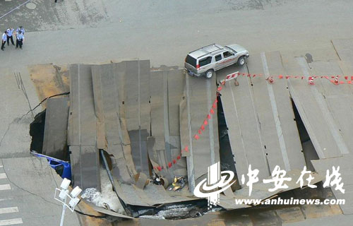 中新網(wǎng)合肥8月8日電(成展鵬 李君)今天中午一點(diǎn)二十分左右,安徽省合肥市長(zhǎng)江中路與徽州大道交叉口發(fā)生路面塌陷,塌方面積約半個(gè)籃球場(chǎng)大,有一輛汽車傾斜在塌陷洞旁的鋼板上。
