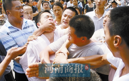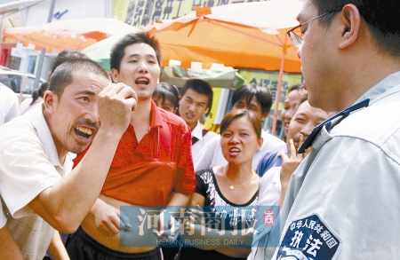 這時(shí)又沖來一中年男子,與執(zhí)法隊(duì)員撕扯起來,場面一片混亂。一攤販告訴記者,這人是朱林的丈夫,姓許,信陽固始人,兄妹八人都在附近做生意。這一帶賣水果的都是信陽老鄉(xiāng),來鄭做生意已有十多年。