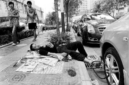洪作剛說,他擔(dān)心即使通過法律途徑對(duì)方也不肯還錢。于是,8月13日下午,他買來一把U型大鎖,白天就將車鎖在下水道鐵柵欄上,連著3天晚上,怕自己睡著、老板將車開走,他就將鎖子的另一頭鎖在自己的腳踝上。晚上,他就睡在馬路邊的報(bào)紙上,路邊蚊子多,他就在周圍點(diǎn)上四盤蚊香。