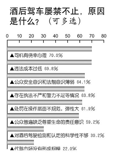 酒后駕車現(xiàn)象屢禁不止,原因是什么?調(diào)查中,70.0%的人首選“司機有僥幸心理”,69.8%的人認為是“違法成本過低”,64.1%的人表示“公眾安全意識和法制意識薄弱”,59.2%的人表示“公眾普遍缺乏尊重生命的責任意識”,22.0%的人選擇了“代駕市場沒有形成規(guī)模”。