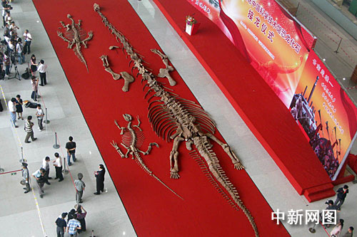 中新網(wǎng)北京8月18日電 (記者 孫自法)三具侏羅紀(jì)時(shí)期的恐龍化石,十八日下午在它們的“新家”——中國(guó)科學(xué)技術(shù)館新館揭開(kāi)“紅蓋頭”,正式由云南省楚雄彝族自治州“嫁”入北京落戶(hù)中國(guó)科技館新館,并將于下月中旬新館開(kāi)放后進(jìn)行永久性展出。