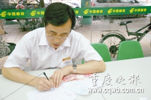 昨下午4點,韓常進走進郵局,填寫一張匯款單。收款人叫蔣世友,四川省安岳縣石羊區(qū)赤云鄉(xiāng)油平村人。去年底,蔣在成都打工時被高壓線燒傷住進空軍醫(yī)院。此時,恰逢代玉秀出車禍也住在這里。