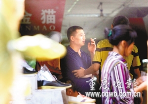 在1995年曾發(fā)生特大火災(zāi)的朝天門(mén)第三交易區(qū)6區(qū),一男子坐在自家衣褲攤前,叼根煙準(zhǔn)備點(diǎn)火。老婆正在看報(bào),出語(yǔ)阻止:“不要吸煙,要遭拘留!痹撃凶尤塘思s兩分鐘,終于還是把煙點(diǎn)起了。記者靠近拍照,女?dāng)傊鳈C(jī)警,趕緊用身子阻擋丈夫,并出手把丈夫的煙頭打掉。