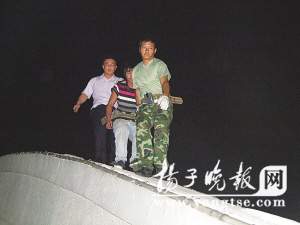 此時(shí),丹陽(yáng)市副市長(zhǎng)、公安局長(zhǎng)張劉茍獲悉后也火速趕到現(xiàn)場(chǎng)指揮救援。由于現(xiàn)場(chǎng)光線不足,救援人員只能模糊地看到高處男子的身影。為了防止男子做出不冷靜的動(dòng)作,救援人員沒(méi)有貿(mào)然行動(dòng),而是在該男子可能掉下來(lái)的地方鋪設(shè)救生氣墊以及架設(shè)起10余張安全網(wǎng)。此時(shí),在云陽(yáng)大橋下的大運(yùn)河中,聞警出動(dòng)的水上派出所的搜救隊(duì)隊(duì)員也已穿好泳衣,隨時(shí)準(zhǔn)備下水救人。海事部門(mén)、路燈管理所和120救援人員也被調(diào)集至現(xiàn)場(chǎng),嚴(yán)陣待命,現(xiàn)場(chǎng)彌漫著緊張氣氛。