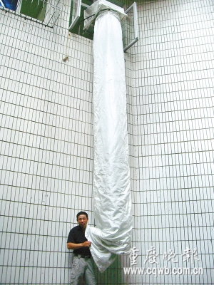 昨日,渝中區(qū)七星崗新華日報舊址后面一商住樓,一條10多米長的碩大布袋從4樓窗口伸出,袋口一直垂到地,不斷有人從袋口鉆出,就像小孩玩“梭梭板”。據了解,這是一種全新的高樓火災應急逃生工具,名叫逃生緩降管,也稱柔性滑道。