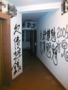 昨晚,記者在該樓20層看到,雪白的墻面上幾乎被黑漆涂滿了字。居民走出電梯或家門,映入眼簾的便是“殺”、“死”、“此屋有鬼”、“欠債還錢”之類的大字。2004室的鐵皮防盜門已被砸得嚴重變形,門鎖上方有一個碗大的窟窿。透過窟窿,記者發(fā)現(xiàn)里面似乎已多時沒有人住了。