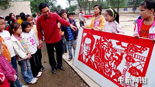 據(jù)了解,該校老師王贊強用一個月時間把《東方紅》、《江山多嬌》、《春天的故事》、《走進(jìn)新時代》等十首紅歌,剪出紅歌剪紙作品,來祝福新中國60華涎。每張紅歌剪紙用朱紙做原料,長1.5米,寬0.8米!稏|方紅》剪紙內(nèi)容除毛澤東主席頭像外,還有學(xué)大寨、第一顆衛(wèi)星上天及原子彈爆炸等內(nèi)容!督蕉鄫伞酚泻\濤總書記頭像、奧運會、神六上天等內(nèi)容,每張紅歌剪紙都包含著濃烈的時代氣息。