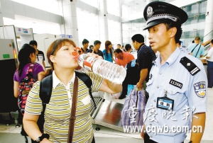 昨日下午2時(shí)許,(重慶市)龍頭寺候車廳檢票處,凡是拿著礦泉水瓶進(jìn)站的乘客,都要先喝一口,然后才能順利進(jìn)站。據(jù)悉,這是重慶鐵路公安處新出臺(tái)的安檢規(guī)定:凡液狀體物品進(jìn)站,一律開瓶檢查,而自帶飲料的,則必須親自喝一口。